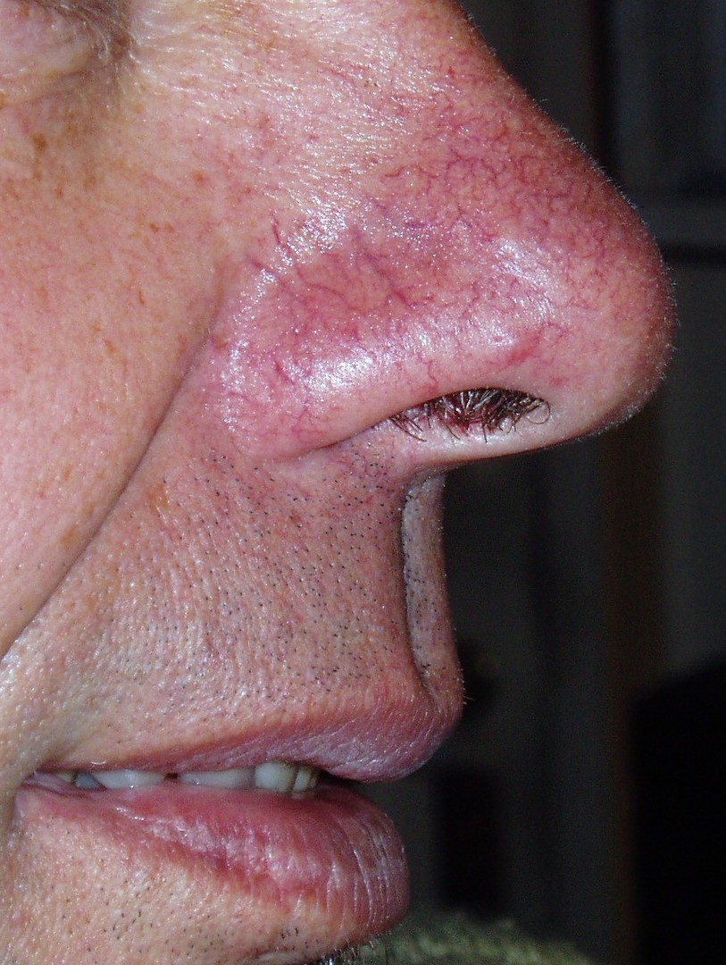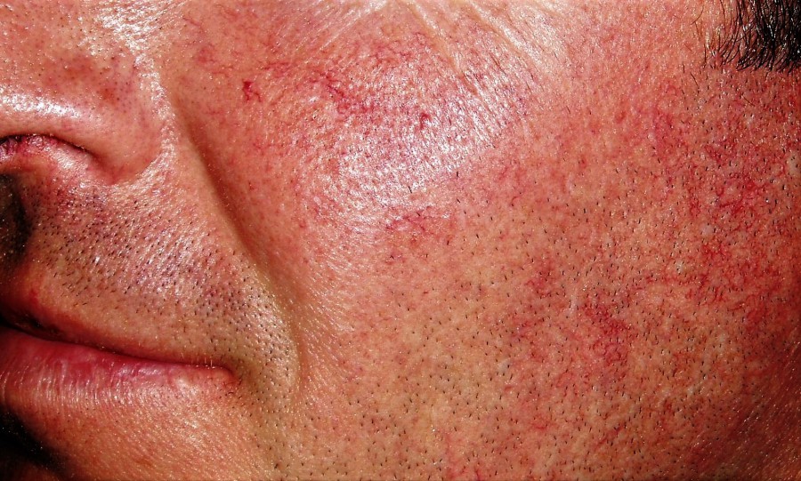On retrouve les télangiectasies sur le visage et le torse.